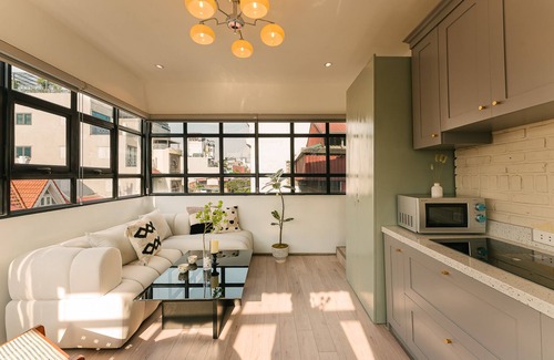The interior combines sleek modern design with the warm industrial charm, providing a stylish yet cozy retreat. The two bedrooms, equipped with plush king and queen bed, promise restful nights after unforgettable days exploring the city. The spacious living room, with its large windows, invites the outside in, making you feel connected to the vibrant energy of Hanoi. A fully equipped kitchen complements the open-plan layout, perfect for preparing delicious meals while soaking in the dynamic street scene outside. This apartment is truly a luminous haven, where the beauty of natural light and urban life come together in perfect harmony.