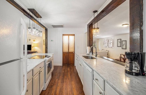 - Fully stocked kitchen with modern appliances, drip coffee maker, and bar stool seating for 2