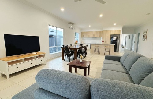 Relax with the whole family at this peaceful place to stay, Our beautiful home is ideally located between Brisbane and the Gold Coast, with easy access to a wide range of popular tourist destinations. Just 30-minute drive from Brisbane CBD and the Gold Coast’s top attractions, including Dreamworld, Movie World and more. Brisbane Airport is also only 30 minutes away. This modern 4-bedroom, 2.5-bathroom home offers everything you could want, with free parking and additional off-street parking.