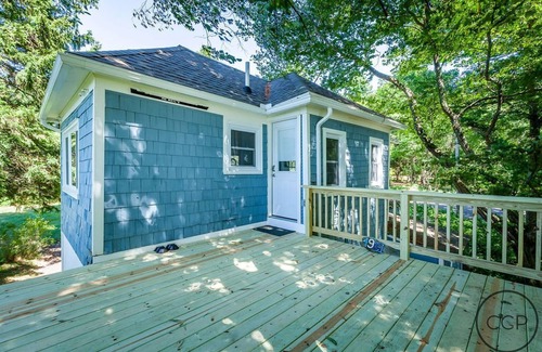 Your beautifully-modernized apartment sits atop an old coachhouse; former outbuilding of a 19th C resort (that no longer exists). Up in your second story aerie, you’ll have an elevated vantage point with plenty of windows facing the water. And every day at 4951, the sun sets in the West, sometimes a ball of flame sinking into the deep blue water at the horizon. Other times not. And you’ll be perfectly situated to witness whatever shapes and colors that day’s sunset takes, whether inside, looking out through the windows, or out on your capacious elevated wooden deck where you’ll be spending lots of time. Here, high amid the waving branches in a green canopy, you’ll be tempted to observe, “We live in a tree house!”