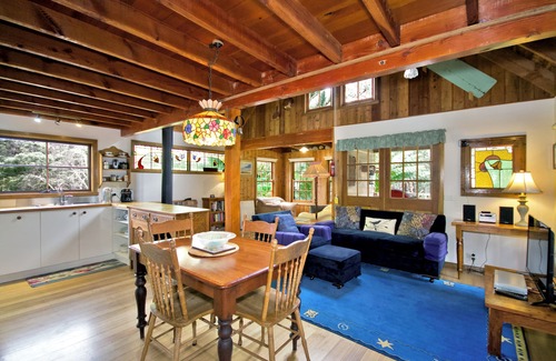 COTTAGE - Willowbank Cottage is 1 bedroom, two story cottage located on a quiet dead end lane. From our deck you can look directly across the street into the bush where the Otway National Park begins. Upstairs in the bedroom, you can look out the windows and feel like you are in the tree tops. Our property (where we reside) is approximately 11/2 acres. The cottage is built mainly of recycled material that we have collected over the years from house demolitions in Lorne.