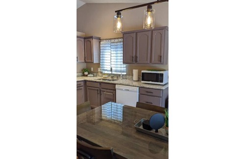 Updated one level home with lots of style! Courtyard entrance with table and chairs. Vaulted living room w/ reclining couches and 50"tv. Fresh eat-in style kitchen with a plank table, coffee bar with a Keurig and courtesy snacks. Everything you need to cook a delicious meal! Master has double closets and comfy king bed. 2nd bedroom has a boho vibe and Tempurpedic queen bed. Go on an adventure in the bunkroom with triple bunks! Outside and a huge paver firepit area with lights for evening fun.