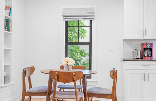 The modern kitchen is fully equipped with high-end appliances, including a gas stove, wine chiller, refrigerator with filtered water, and a dishwasher. Coffee lovers will enjoy the coffee machine, drip maker, and tea kettle. A sleek dining area comfortably seats 4 guests, ideal for both intimate meals and morning coffee sessions.