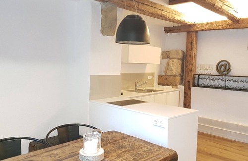 In the center of the wonderful Remstalgartenschau 2019! You live comfortably and stylishly right in the historic old town of Schwäbisch Gmünd, in the traffic-calmed area, just a few meters from the beautiful market square. The 49 square meter apartment is located in a listed building, 2019 completely refurbished and renovated. The high-quality equipment and the charm of the old house will turn your holiday into a dream holiday in the heart of the Staufer town. The apartment has a high quality and well equipped kitchen with adjoining cozy dining area. The hand-planed oak floor and the wooden beamed ceiling create a particularly comfortable atmosphere. And the walls, which are only renovated with natural materials (loam and lime), ensure a healthy indoor climate. Individual furniture and beautiful accessories make you feel at home right from the start. In the bathroom with the natural stone wall and the old preserved wooden beams, underfloor heating ensures a special sense of well-being and relaxation. The apartment also has a small balcony overlooking the King's Tower and the Zeiselberg. Enjoy a cappuccino from the Nespresso machine or a glass of wine or soft drinks from the "mini-bar", which we have ready for you at your own cost. A TV and private Wi-Fi is available to guests free of charge. On the ground floor there is a traditional wine shop with local and international wines, as well as delicacies in the assortment. The house is located in the traffic-calmed area.