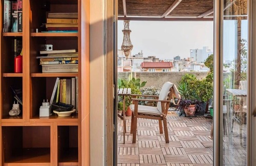 This beautiful independent cozy loft, located on the top of a big residential building in the heart of the city. The highlight of the loft is the huge roof garden with a bamboo cover structure and a cozy set of outdoor furniture, perfect for enjoying a cup of coffee or a glass of wine while watching the sunset and skyline. The tasteful and modern design of the interior creates a fresh and enjoyable space, perfect for relaxation and summer vacations.