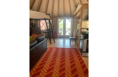 Yurt dwelling is indescribably peaceful. Our property is 150 acres total, off the last end-state maintenance road in the county, though just a 20 minute drive off interstate 81, or to the quaint town of Floyd, or the Virginia Tech area. This one is a 24' yurt, beautifully modern with a fully-equipped kitchen, bathroom and steam-sauna shower, TV and wi-fi, and comfortable sleeping and hangout spaces- surrounded by 150 acres of streams, trails and natural beauty. Dogs welcome!