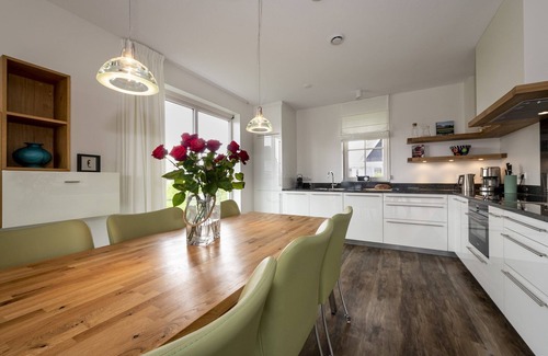Layout: Ground floor: (hallway(toilet), Living room(TV(flatscreen, smart TV), gas fireplace), open kitchen(electric kettle, toaster, cooker(5 ring stoves, induction), coffee machine(cups, filter), combination microwave, dishwasher, fridge-freezer, Juicer), storage(tumble dryer, washing machine), garden doors) On the 1st floor: (bedroom(double bed(boxspring), TV(flatscreen, smart TV)), bedroom(double bed or 2 single beds(boxspring), TV(flatscreen, smart TV)), Bedroom with bathroom(double bed or 2 single beds(boxspring), TV(flatscreen, smart TV), shower, washbasin), bathroom(shower, washbasin, toilet), Landing(toilet)) jetty, heating(floor heating), terrace, garden furniture, parking