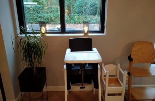 The bungalow has 2 bathrooms, both equipped with rain showers, and 2 toilets. Warm up in the spacious living room with underfloor heating and the large wood stove, protected by a large rack for child safety. Cook cozy meals on the large kitchen island with 4 seats and relax at the 8-person dining table, under the patio with a wood stove, or on the lovely outdoor terrace. Enjoy the heated outdoor shower and the convenience of the separate laundry room with a washing machine and dryer. Explore the forest plot of over 1000 m2 and play a game of table tennis. Easily park 2 cars on the property.
