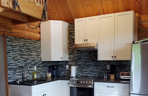 Chip's Cabin is a self-contained cabin with an upstairs loft that includes 2 double beds while the main floor has a double pull out sofa, a 3-Piece bathroom and a full kitchen. The owners live on the property in separate housing. Guests have Chip's Cabin to themselves.
