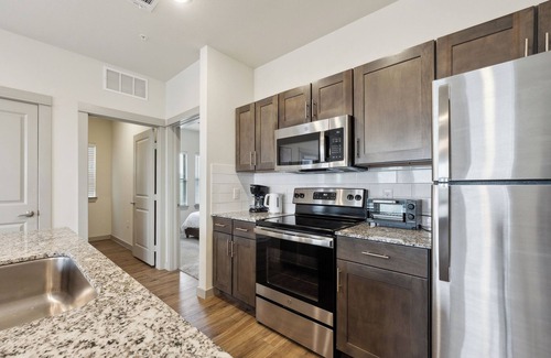 This modern unit features upscale décor, a fully equipped kitchen, cozy living space, and all the essentials for a comfortable stay. Enjoy high-speed Wi-Fi, in-unit laundry, smart TV, and a peaceful setting just minutes from Fort Worth and Dallas. Whether you're here for work or relaxation, this space is designed to feel like home.