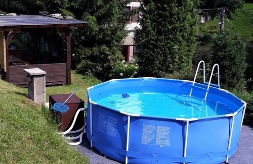 Chlívce 8 km from Hronov: Cosy country house "Chlívce u Hronova", 2 storeys, detached. Outside the resort, in a quiet, elevated position. For shared use: property 1'000 m2, swimming pool round (4,60 m diameter, seasonal availability: 01.Jul. - 31.Aug.). Arbour, garden furniture, barbecue, fireplace, barbecue house, children's playground, parking at the house. Shop 3.5 km, shopping centre 8 km, restaurant 250 m, bus stop "Chlívce" 500 m, railway station "Hronov, Červený Kostelec" 8 km, outdoor swimming pool 9 km, indoor swimming pool 35 km, natural swimming pond 4 km. Ski lift, slopes 200 m, cross country ski track 10 m. Nearby attractions: Muzeum Aloise Jiráska/Hronov 8 km, Adršpašsko-teplické skály 17 km, Broumovské stěny, Náchod 17 km, Ratibořice a Babiččino údolí 20 km, Broumov 28 km, Relaxpark Pec pod Sněžkou 50 km. Well-known ski regions can easily be reached: Radvanice 10 km, Petřikovice 16 km, Mladé Buky 34 km, Janské Lázně 40 km. Well-known lakes can easily be reached: vodní nádrž Rozkoš 25 m. Children's house in the garden. It is possible to arrange meals in a private club, which is at a distance of 250 m (on request). This cottage can be rented as a whole house or separately as 4 fully equipped apartments in the low season.
