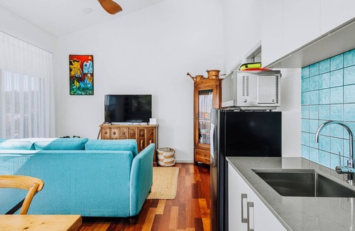 The Mediterranean is the larger of two available studios and is designed to comfortably accommodate up to 4 guests. The spacious open-plan living area includes a dining table for four, air conditioning, and a fully equipped kitchen with a gas cooktop, electric oven, fridge, microwave, and coffee machine, making it ideal for a relaxing holiday. The beautifully furnished queen bedroom features built-in wardrobes and air conditioning for maximum comfort. The lounge area includes a queen-size sofa bed, providing additional sleeping space for two guests.