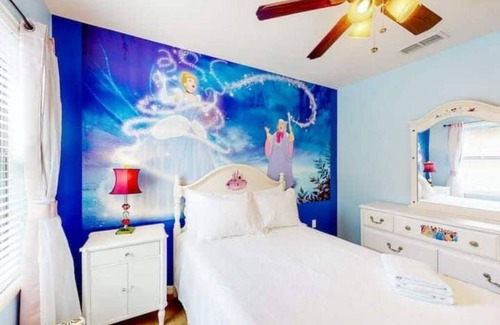 This 5-bedroom, 4-bathroom home is located just 20 minutes from Disney World and features a private pool, hot tub, and Cinderella and Star Wars themed rooms. The home is perfect for families or groups of friends looking for a fun and relaxing vacation. The patio with private pool and hot tub is the perfect place to relax after a day at the parks. The home is also equipped with a full kitchen, washer and dryer, and free WiFi. It is located in a quiet neighborhood.