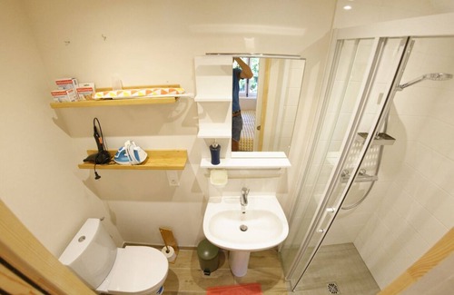 The kitchen is equipped with an oven, a stovetop, and a refrigerator, as well as a coffee maker, an electric kettle, and a microwave. Bathroom amenities include a hair dryer, towels, and toilet paper. Other amenities include a BBQ grill, bed sheets, an ironing board, and heating.
