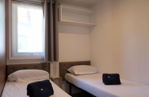 "Happy Premium Suite", 4-room mobile home 30 m2. Comfortable furnishings: living/sleeping room with dining table, electric heating and air conditioning. 1 room with 1 french bed (140 cm, length 190 cm). 2 rooms, each room with 2 beds (70 cm, length 190 cm). Open kitchen (4 hot plates, microwave, freezer, electric coffee machine). Shower/WC. Air-conditioning (extra). Terrace partly roofed. Terrace furniture, electric barbecue (portable), deck chairs (2). Facilities: mosquito net. Reserved parking (1 car). Please note: non-smokers only.