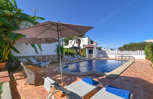 Classic and comfortable villa with private pool in Javea, on the Costa Blanca, Spain for 4 persons. The house is situated in a coastal, hilly and residential area, close to restaurants and bars and at 4 km from El Arenal, Javea beach. The house has 2 bedrooms and 2 bathrooms. The accommodation offers privacy, a beautiful lawned garden with trees and a beautiful pool. Its comfort and the vicinity of the beach, places to shop, sports activities, places to go out, sights and culture make this a fine villa to spend your holidays in Spain with family or friends and even your pets.