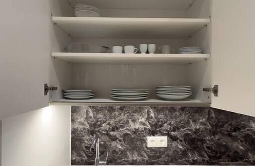 In the kitchen area, where white cabinets offer a complete design elegance, kitchen equipment such as refrigerator, stove, oven, microwave, coffee maker, toaster and more are always at hand so that you can use your cooking skills as you wish. There's also a wooden dining table for four, so you can turn this pleasure into dinner together.