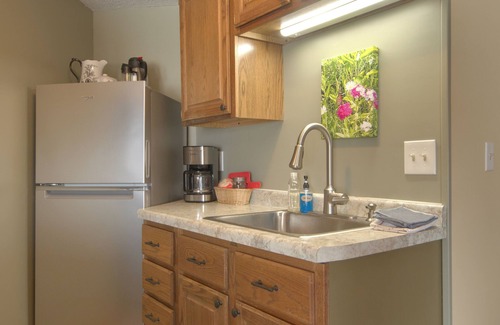 This second (top) floor 2 bedroom unit features an open plan kitchen-dining-living space that opens up to your own private balcony overlooking the lake (perfect for morning coffee or evening cocktails). The living and dining area has comfy furniture and table seating for 4 - both situated to enjoy views of the lake during the day and tv or a movie at night. The clean and updated kitchen includes an apartment-sized stove with oven, fridge, microwave, toaster, and a coffee maker. There's a queen bed in the main floor bedroom and a spiral stairway leading up to a loft with 2 additional twin beds. This unit feels modern and cozy thanks to the updated fixtures and thoughtfully laid out furnishings.