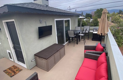 Your home away from home in Burbank with one bedroom and a great balcony with a view. Step into this penthouse featuring a queen bed, a cozy living room with a queen sofa bed, and a fully stocked kitchen. Enjoy the superb amenities like a laundry room, Central AC, BBQ, off-street parking with EV charger, and many more.
