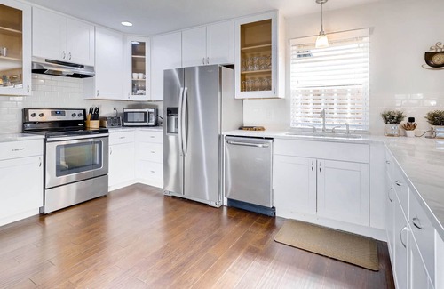 The recently renovated Linda House is an enjoyable and relaxing retreat for guests and families. Whether it is an adult retreat, family vacation or flexcation you are seeking, this house offers all the relaxing amenities of home mixed with the plushness of vacation living. This five bedroom, three bathroom house is specially cleaned, disinfected and prepared for each guest. It sleeps 16 and offers spacious living with a fully equipped kitchen, breakfast room, living room, dining room, laundry room, and game room equipped with ping pong, fooseball and poker table, rolling cart bar and small fridge. This house is equipped with wifi and 8 TV's are located throughout. Nestled in the back yard is a private solar heated pool, March - October (above freezing temperatures ) and patio oasis with plush seating, additional dining, grill and big screen tv.