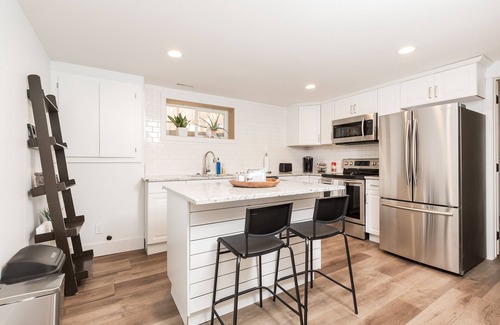 The suite includes a Queen sized bed, Double bed, Twin bed, large walk-in closet, laundry and dryer, a full kitchen, fast Wi-Fi, 2 Smart TV's, Disney+, Netflix, a fireplace, guest controlled heat and A/ C, a desk, and much more!