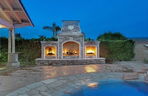 • 21 ft wide and 14 ft tall triple outdoor fireplace, 5 ft circular fire pit, natural gas Commercial Restaurant BBQ with 10 pilots and 10 heavy solid cast burners, professional 48” x 60” aluminum prep table, aluminum food serve tray on casters, 3 stainless steel chafers upon request, and more…