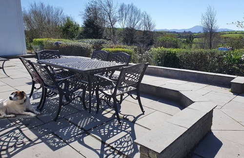 Luxury family house on quiet country lane overlooking Clew Bay. Our 4 bedroom, 3 bath, house sits on 7 acres on an elevated site 200m from the shores of Clew Bay. Take in the panoramic views of the bay and Croagh Patrick from the 100 sq m patio complete with 4 person hot tub. Inside, the house consists of a renovated Irish country cottage as an open plan kitchen-living space connected with a two-sided wood burning stove and a modern extension with four bedrooms, 3 baths, and a play room. The master bedroom ensuite has a large, walk-in, shower and restored cast-iron Edwardian bath. The upstairs bedroom commands the best views in the house and has a private shower room. Downstairs are two children's bedrooms, one with bunk beds and one with a double bed, and sharing the main family bathroom.