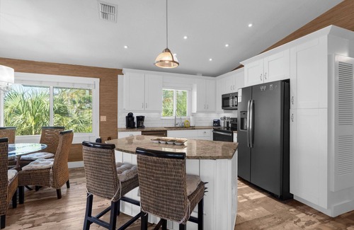 Inside, you will find the living, kitchen, and dining area create the perfect space to gather, relax, and share meals. The home's laid-back coastal style blends comfort with island charm, and large windows fill the space with natural light. The fully equipped kitchen has everything you need for home-cooked dinners or tropical cocktails, while the outdoor screened balcony is perfect for enjoying meals alfresco without missing a beat of the island breeze.