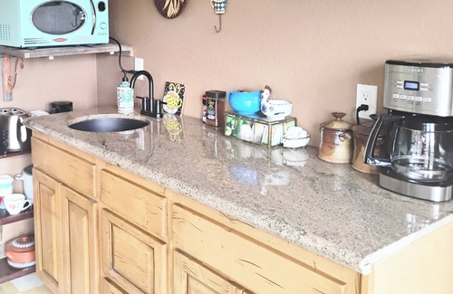 This unit is all downstairs; we, as hosts, live upstairs. This Casita has a bedroom with a king size bed, a private bathroom, living room, a kitchenette (not a full kitchen- has a small refriger/ freezer, a rice maker, a coffee maker, microwave oven, convection oven, electric water heater, plates, bowls, utensils Etc. & Barbeque grill out on the patio. There's no sink to wash dishes except in the bathroom (dish rack and soap under sink). We are sorry that there's no sink for the dishes, but we know some guests really appreciate at least having the option to prepare simple meals with some basic cooking items. We have many who cook almost all the meals here or barbeque every night. If you don't want to wash dishes, you'd need to bring your own disposable plates & cups just like at a motel.