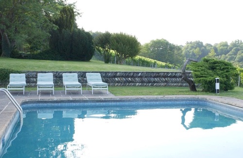 The Clos Mirabel Estate is set amidst the gentle hills of Jurançon in 15 acres of private parkland. The shared seasonal outdoor pool, grounds and terrace offer breathtaking views out over vineyards to the complete mountain range of the Pyrénées Atlantiques.