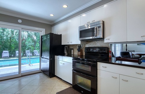 The fully stocked kitchen is between the Dining Room and the Family Room. There is absolutely everything you would need to cook in this house along with a Keurig, a Mr. Coffee coffee, and a tea kettle to get you started in the morning. The sink and ice maker have filters so no need to run out and buy bottled water or ice and there is a Brita pitcher in the refrigerator. We also have a mini-fridge that will hold all your cans and bottle so that leaves plenty of room for just food in the main refrigerator. The pool is just outside of the Kitchen via sliding doors.