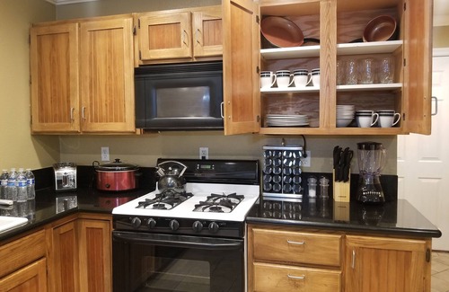 Situated in a mature quiet neirborhood, A Guge Private Gated Guest House, Open Floorplan, Huge Kitchen, Open Dining Room and Living Room. 2 Bedrooms, 2 bathrooms, 2 Private Covered Patios, Ideal for entertaining and for having privacy. This space was remodeled and the construction ended 11/17/2018. Elegant, Modern Design and Décor. Everything is new. It has a full kitchen. The House can accommodate 8 people. We have pots and pans, plates and silverware for 8.