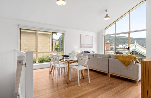 A beautiful North facing sunlit open plan living area upstairs enjoys views of the ocean, Marriners lookout, and the green rolling hills of Apollo Bay.