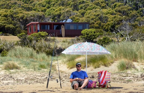 Cloudy Bay Cabin is situated on the southern coast of Bruny Island. This private and remote accommodation is surrounded by the South Bruny National Park and fronts onto the magnificent Cloudy Bay beach. If you are looking for peace and quiet in beautiful surroundings then Cloudy Bay Cabin can provide it. Access is by a private unsealed track which leads in 4 km from Cloudy Bay Rd and is suitable for all vehicles. The nearest neighbour is out of sightat least 1km away. The beach in front of the cabin is suitable for families to swim, wander and play. The beach at this end of the bay is calmer making it ideal for younger children. A recent comment was that the gas heater is a great instalment, as chopping wood and relighting fires after a hard days relaxing was no longer fun.
