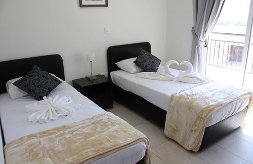 Our beautiful spacious 2 bedroom / 2 bathroom apartment which will comfortably sleep 4 and is modernly furnished throughout is located towards the front of the complex, overlooking Paphos. The apartment has ample open plan living / dining / kitchen area, for a comfortable stay with dedicated wifi for our guests. There are 3 balconies each offering spectacular sea views. The apartment roof terrace offers a breath taking, over 180° panoramic unrestrictive view across Paphos and Coral Bay and a spectacular sunset in the evening.