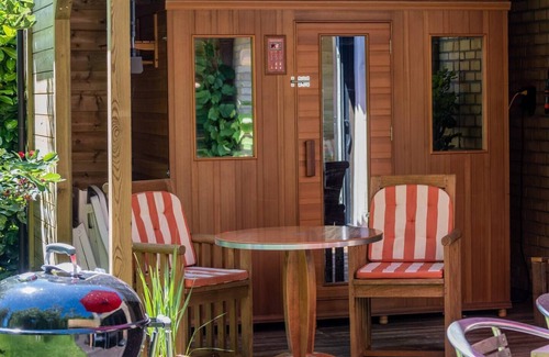Through sliding window access to the wooden terrace with teak garden furniture and the health mate infrared outdoor sauna for 5 people and a charcoal BBQ from Weber.
