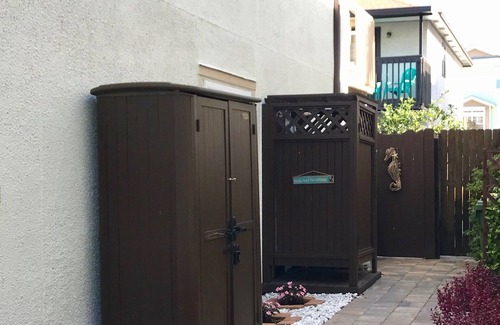 There is a beautiful paved private patio in the back perfect for relaxing in the evening shade. An outdoor private shower provides hot and cold water. A grassy courtyard area is available in the front area for you to relax and catch the ocean breeze.