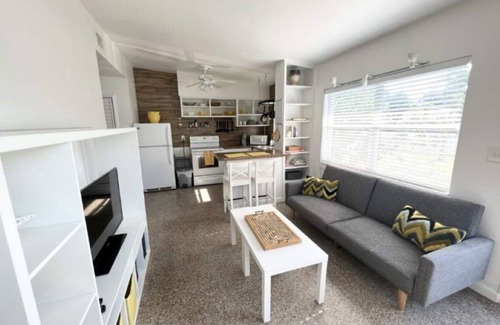 Located two short blocks away from the beach, bars and restaurants. The open floor plan flows from living room to kitchen, and is tastefully decorated in grey and yellow. The living room features a new sofa sleeper for additional sleeping and a SMART TV.