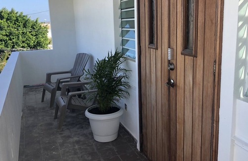 This is a large studio with kitchenette, closet, large bathroom with tub and separate walk-in shower, a queen sized bed, balcony and private deck with sweeping views of the ocean and a quick 5 minute drive to the beach.