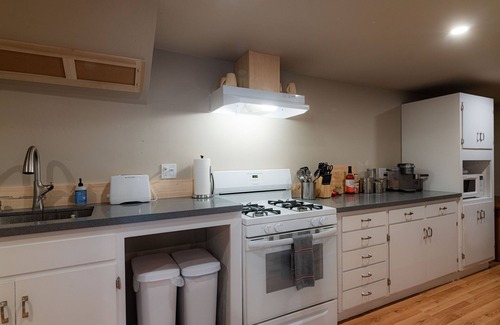 Relax with that someone special in this comfortable suite with its king sized bed, 2 person shower, and spacious tub. It has a nicely equipped galley style kitchen with a full size fridge, range, and microwave. We recently added a washer and dryer to the unit for your convenience. The deck overlooks our timberland backyard, equipped with a gas grill. The living room has a full sized sofa sleeper and 55 inch Smart TV.
