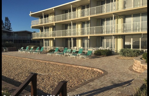 Ocean front condo directly on the beach with swimming pool. Two bedroom, two bathroom first floor unit with amazing views of the ocean and beach. Walk 50 feet from rear patio to step onto the beach sand. Our unit is located in a small 3 story building with 9 units total. You will have access to the swimming pool and one car garage.