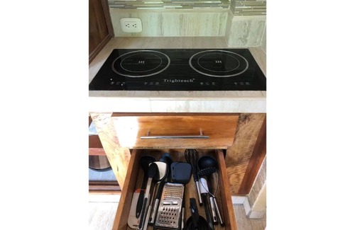 Twin daybed for overnight quests or naps. Built in work counter. Great for office or preparing for night on the town. Pizza oven on beach and tables. Gourmet dinner served on beach or delivered to your house by reservation. Ask Helen. Kayaks, boogie boards available. Ask Helen She is full of good tips.. 15 minute walk down the beach to 4 different restaurants. Quick taxi takes you to dancing. Air conditioning from 8PM-8AM.