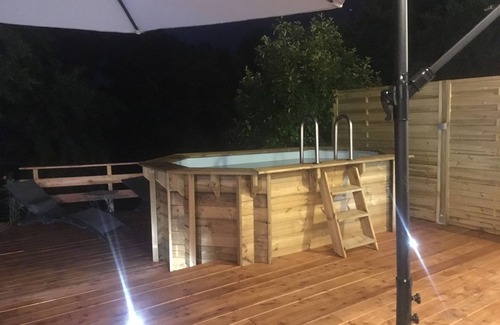The two rooms give directly, by bay windows, on a wooden terrace equipped with a privative swimming pool 2m * 3m, with chairs and necessary for meals outside, in full nature, with beautiful view on the woods.