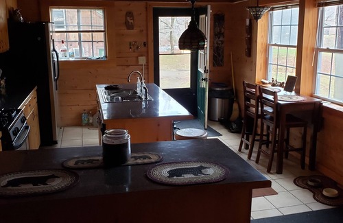 What a gorgeous spot, land that is park like bordered by over 1200 ft of stream frontage. They just stocked the stream with 1000 brook trouts, so you can fish right here. There is also a cute beach on the property. Log home is filled with warmth. Open main floor living. Kitchen has an island plus breakfast bar.***** COMPLIMENTARY BEDROOM SUITE WILL ONLY BE UNLOCKED AND ONLY PROVIDED FOR RESERVATIONS OF 5- 8 GUESTS. THIS BEDROOM SUITE IS LOCATED DOWNSTAIRS ON THE MAIN FLOOR. ***** Nice staircase to 2nd floor with 3 good size bedrooms & another 3/4 bath. Another stairway to 3rd floor leads to 2 large rooms we are working on. You can see the stream from every window in this home. Sims Stream Road is an ATV and snowmobile trail as well. We also have outside cameras for your security.
