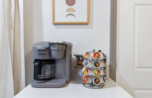 The dedicated coffee bar offers four brew options: Keurig, drip, pour-over, and French press, with a selection of K-cups, sugar, and creamer provided.