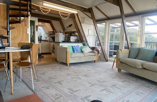 Panoramic views of the sea/beach from every area. New joinery in kitchen, which includes new fridge plus oven and under-bench freezer. Bathroom has shower, toilet and washing machine. Large decking area that is partially covered with clear-light and is like an outdoor living area. Boasting a 4 meter outdoor table. Fully fenced off area with compact lawn to relax.