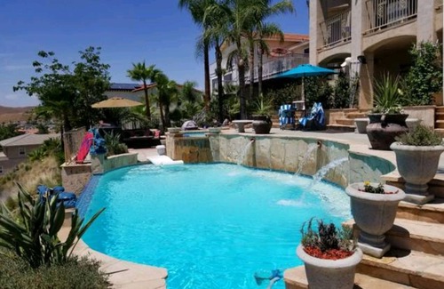 Our modern, Mediterranean-style home faces sunrises to the East off the driveway, and faces panoramic sunsets over the community lake, and the Ortega Mountains on the Western rear view. Your access comprises spacious family room with TV over fireplace. There is a full outside terrace, and a full veranda off the pool/spa with spacious patio seating and lounging areas. BBQ on the terrace, or BBQ down by the pool. Also, a pool side powder room is available for use with its exterior wall shower after a swim or jacuzzi spa use.