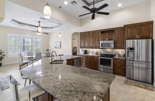 The glass multi slide patio doors open up to a beautiful screened-in lanai area where you can relax in the amazing heated pool overlooking the canal. There is a large gas grill and a charcoal smoker egg in the patio area for you grilling needs. The fully equipped kitchen includes all stainless steel appliances, granite countertops, and a large breakfast bar that seats 6. The private dock is available for your use.