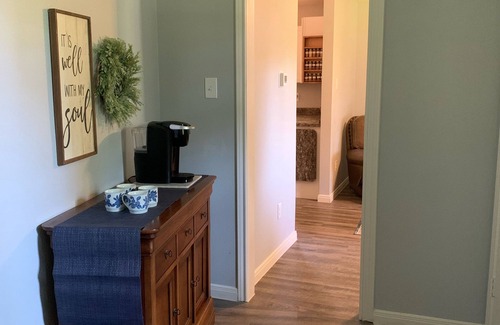 Come enjoy all the comforts of home in this secluded woodland setting. Most of our guests are transitioning from one home to another, which can be stressful, but we strive to make you comfortable. To that end, this one-bedroom/one-bath home boasts comfortable furnishings, a queen bed with a new mattress, indoor laundry, a huge fenced yard, ... And! You'll love the porches! One in front and one in back for your morning coffee or evening fire-fly-watching pleasure.