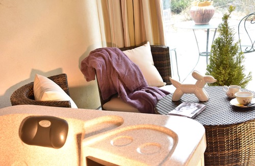 A winter garden with a spa and garden furniture.